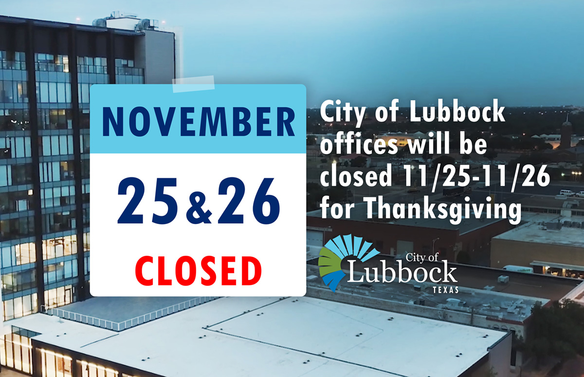 City of Lubbock offices will be closed Thursday, November 25, and Friday, November 26, for Thanksgiving. Regular business hours will resume on Monday, November 29.