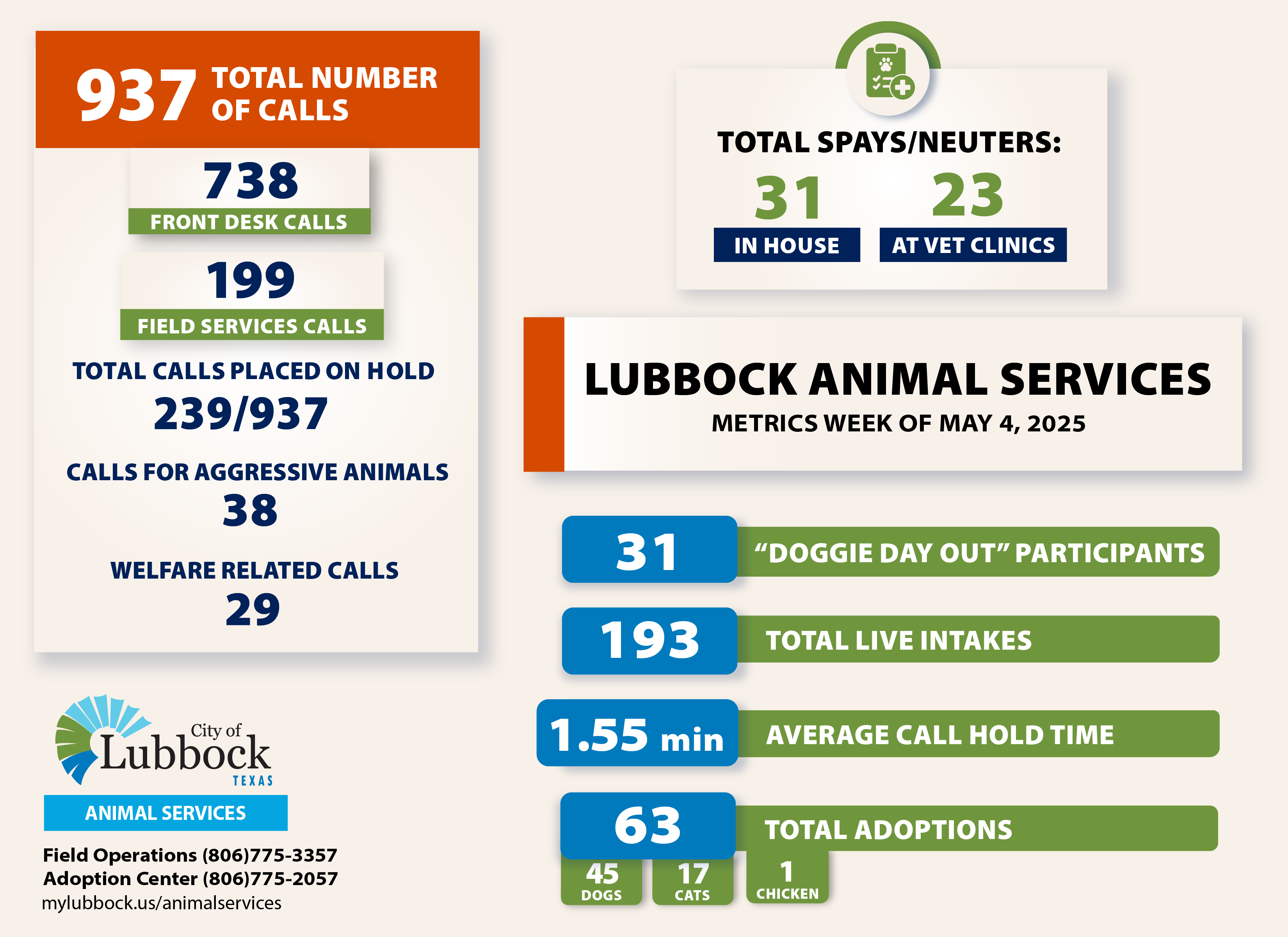 For monthly metrics and other information regarding volunteering, fostering, or adopting through LAS, visit mylubbock.us/AnimalServices.