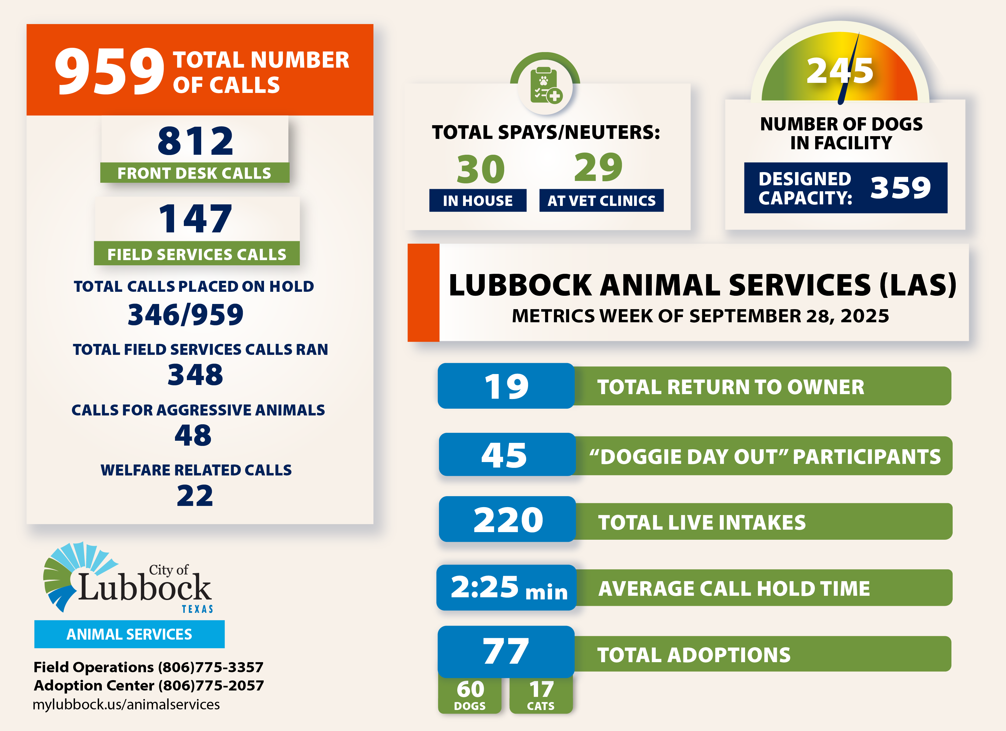 For monthly metrics and other information regarding volunteering, fostering, or adopting through LAS, visit mylubbock.us/AnimalServices.