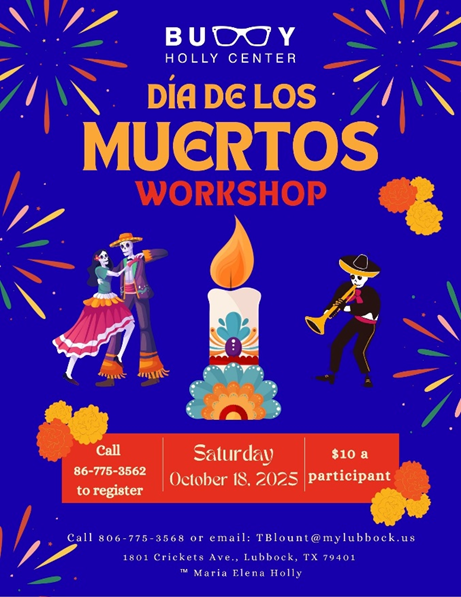 Lubbock, Texas – The Buddy Holly Center is pleased to announce our Día de los Muertos workshop this Saturday, October 18, 2025, from 2-4pm. The cost is $10 per person.