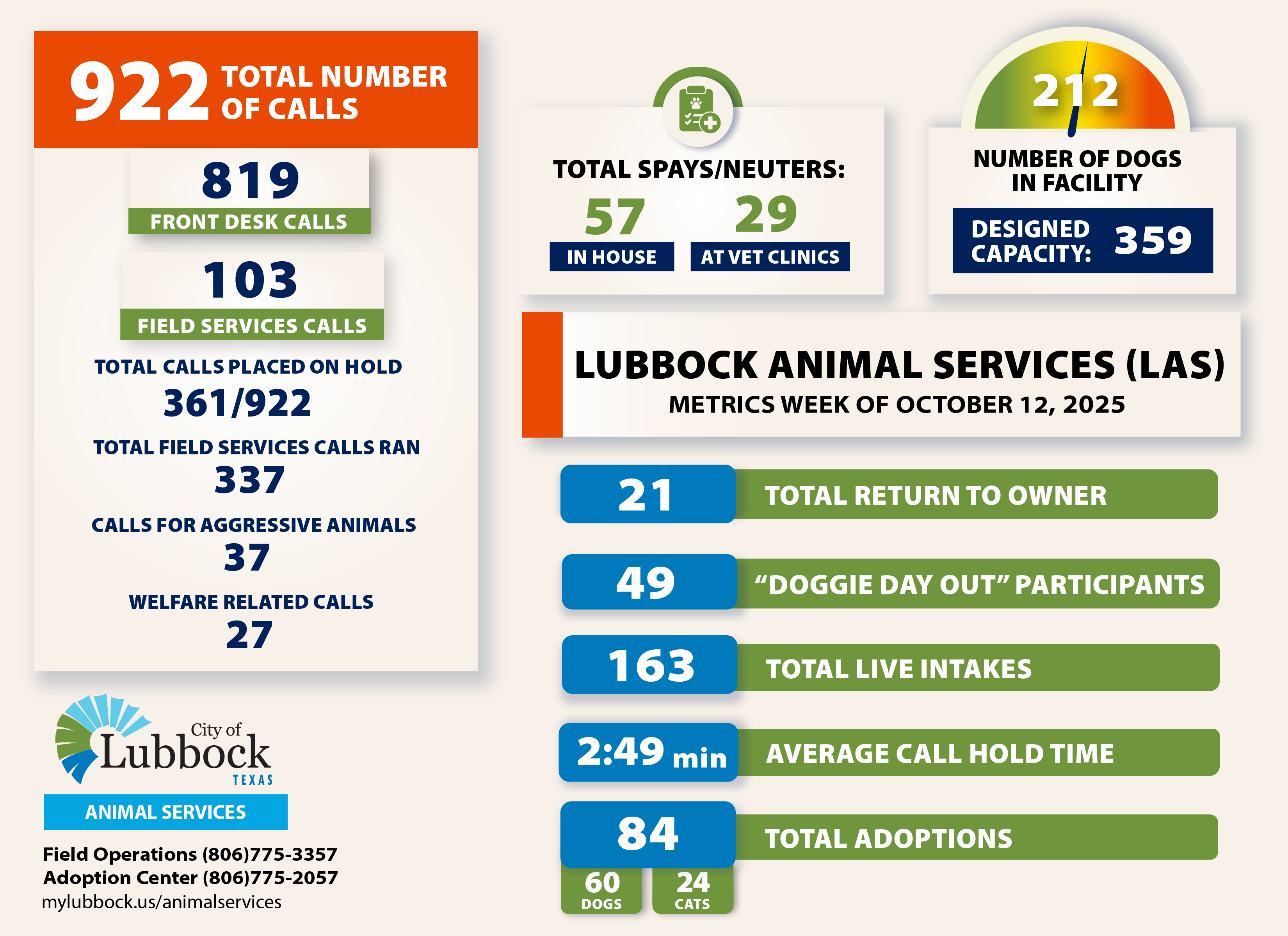 For monthly metrics and other information regarding volunteering, fostering, or adopting through LAS, visit mylubbock.us/AnimalServices.