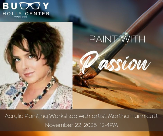 The Buddy Holly Center is pleased to announce artist, Martha Hunnicutt’s Paint with Passion workshop, November 22, 2025 from 12pm-4pm.