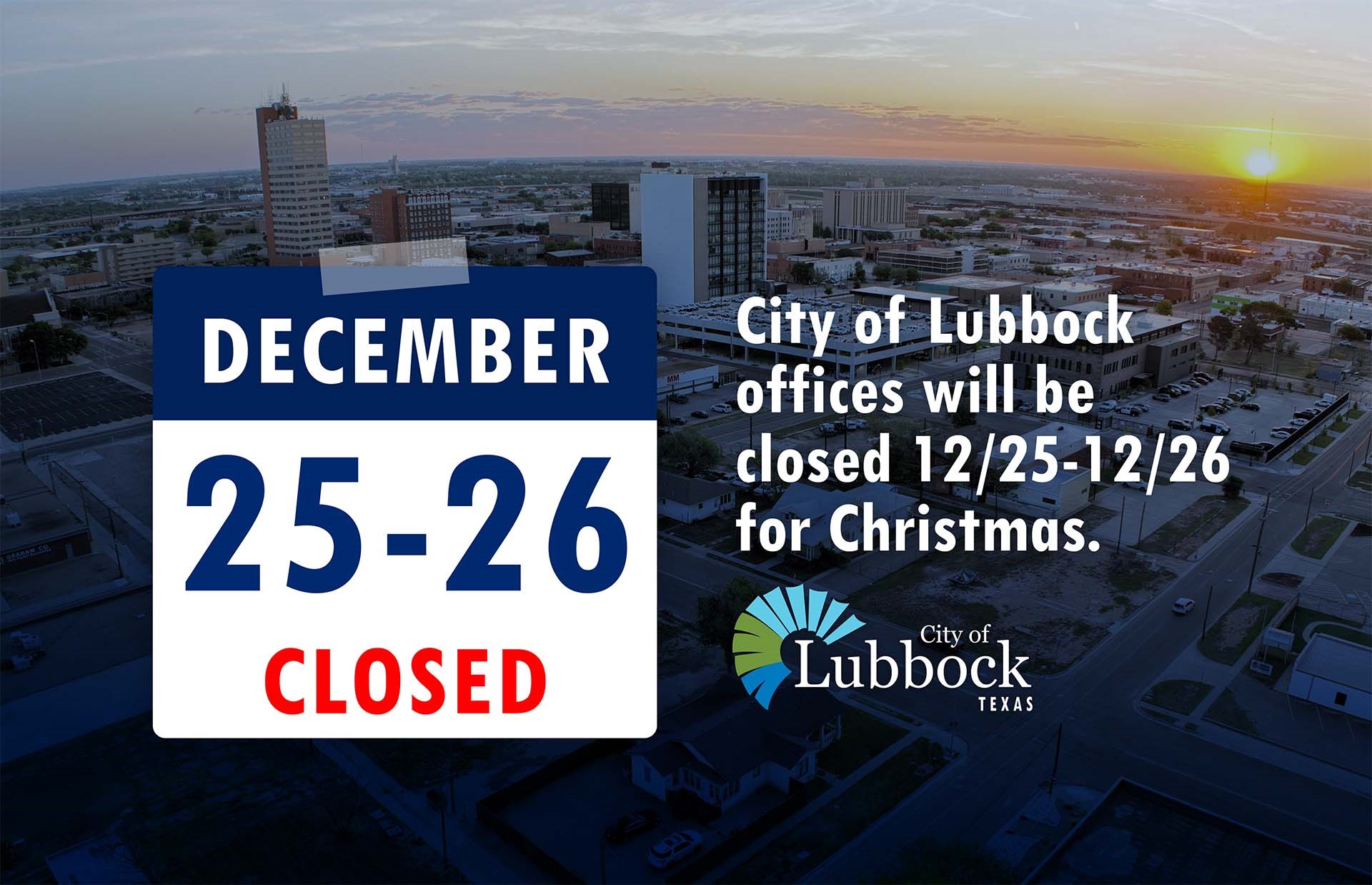 The main City of Lubbock offices will be closed Thursday, December 25, and Friday, December 26, in observance of the Christmas holiday. Regular business hours will resume on Monday, December 29.